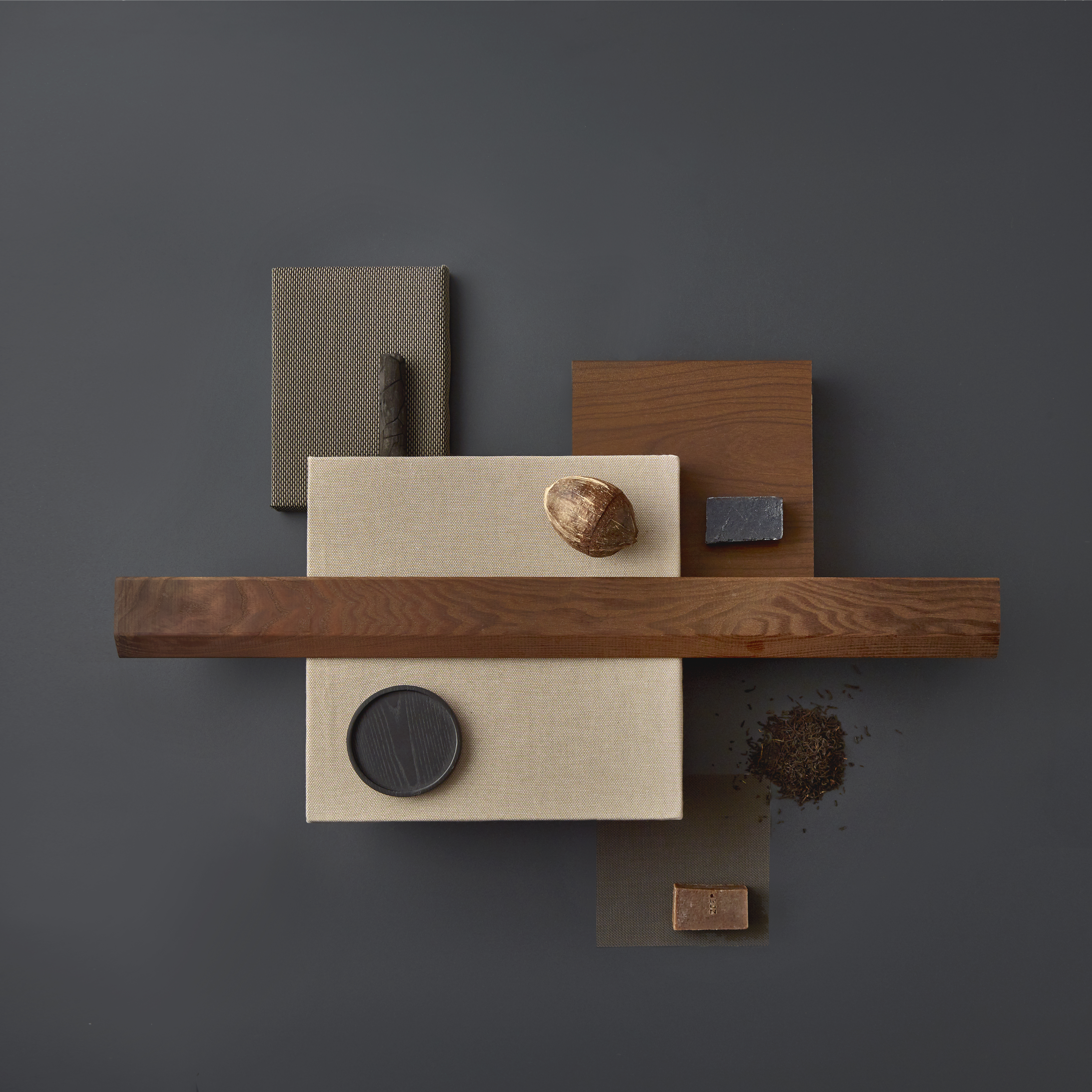Centuries-old Japanese temples never fail to capture the imagination. Their typical blackened wood and walnut hues are paired with canvas beige and olive green. These dark, natural tones create a protective, calming atmosphere.
