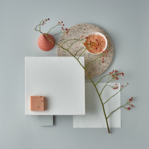 Terrazzo in different tones is combined with clean, smooth textures. The colour palette is a combination of an energetic soft coral tone with whites and soft grey with a greenish undertone. The orange pink gives a warm and youthful accent.